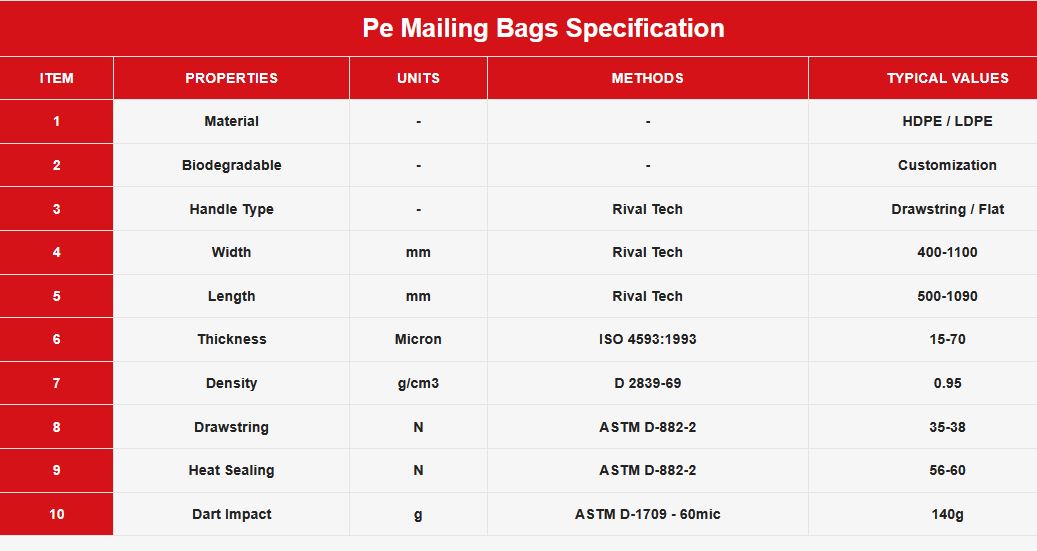 The mailing bags are perfect choose for shipping your product to keep them safe. Rival drawstring garbage bags are made of polyethylene, which is non-toxic, tasteless, safe, and environment-friendly. With a self-pull packing function, you can avoid secondary contact with pollutants clean and dirty hands, and can easily discard them. The winding method uses a point break design, which has the advantages of making bags that are easy to separate, with perfect side seals. The thickened design is very tough, with strong puncture resistance to avoid sharp edges and corners that cause bag damage. Accept customers’ personalized printing requirements, brand your company or product.