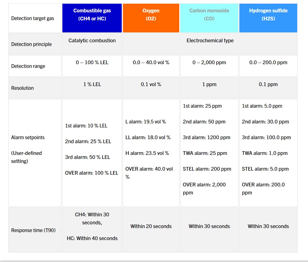 The GX-Force operates 30 hours on a Li-ion battery, and has a large LCD display showing all gas readings, battery level, current time and automatically backlights in alarm conditions. Standard alarm types include vibration, visual, and audible alarms, which can be set to latching or non-latching. Controlled by a microprocessor, the GX-Force continuously checks itself for sensor connections, low battery, circuit trouble, low flow, and calibration errors.