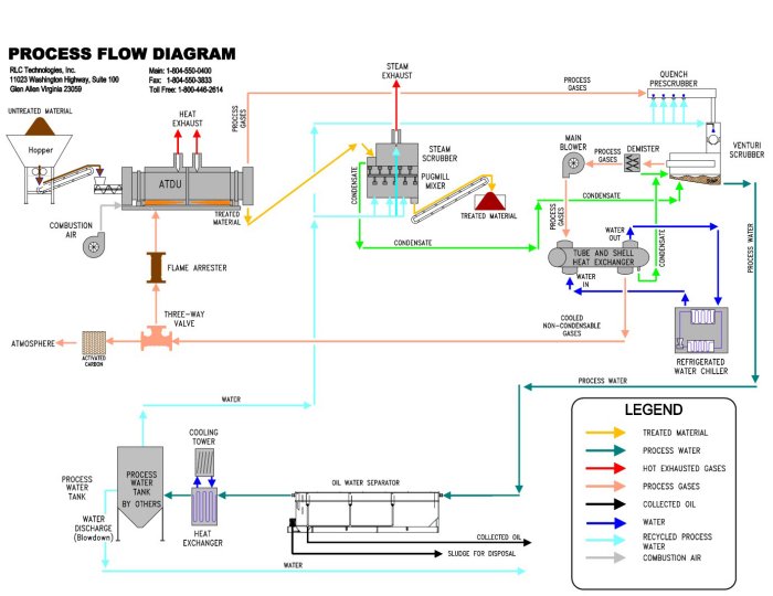 The process gasses leaving the ATDU are normally between 800ºF - 1000ºF (430ºC - 540ºC). The volume of gasses to be treated depends on the contaminants and the feed rate through the plant. The off-gas flow rate can range at approximately 1000-5000 ACFM (30 - 140 m3/min). The gases exiting the ATDU pass through a mechanical collector designed to remove approximately 50 - 60 percent of the dust from the ATDU. It collects the larger particulate matter from the exhaust gas stream prior to the Scrubbers. The collected dust is then discharged through air-sealed valve into the soil-conditioned system. After the mechanical collector, the gases first pass through the Pre-Scrubber, where they are scrubbed with water to reduce the temperature and remove most of the oil and the remaining particulate matter. In the pre-scrubber, the temperatures of the gasses are reduced to below 200ºF (90ºC). The gasses are then further scrubbed utilizing a Venturi Scrubber where the temperatures are nominally reduced to below 130ºF (55ºC). The Venturi Scrubber will remove almost all the remaining particulate from the gas stream. However, to achieve greater removal efficiency an additional separator with Demister is implemented after the Venturi. At or below approximately 130ºF (55ºC) temperature range virtually all hydrocarbon vapors in the gas stream have been condensed out. The VRU employs an indirect Heat Exchanger/Condenser in conjunction with a chiller to further reduce the process gas temperature and any remaining hydrocarbon residues in the gas stream. After the Heat Exchanger/Condenser, the volume of the gases will be reduced to less than 100 ACFM (3 m3/min). In cases where volatile light ends are still detected in the gas stream, they may undergo a final treatment through one of several options including activated carbon, bio-filter or thermal oxidation inside the ATDU furnace.