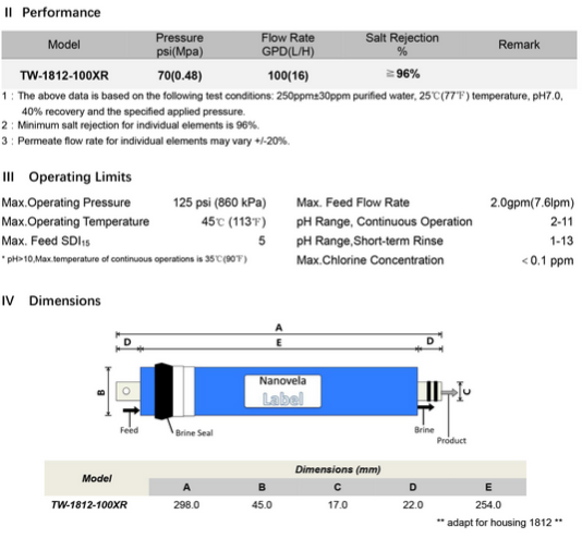 Nanovela RO element TW-1812-100XR is made by Polyamide Thin-Film Composite for household water purifier system. With features of stable flux & high salt rejection, it is the new generation of energy-saving and high recovery product. Nanovela Elements adopt advanced automated rolling process and take FILMTEC Membranes as the core component. The long-term performance of Nanovela Elements is stable.