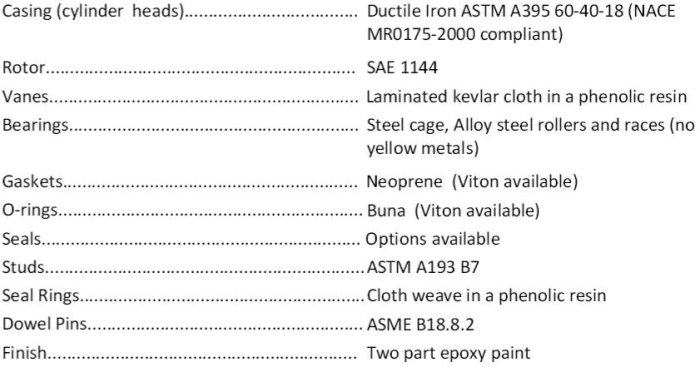 Inlet Connection 3` ANSI Class 150 Flat Face Flange.Outlet Connection 3` ANSI Class 150 Flat Face Flange.Operating Speed Range 690 rpm through 1465 rpm.Maximum Allowable Working Pressure 80 psig (5.5 barg).Maximum Allowable Operating Temp 350°F (176°C).Shaft Seal Single face mechanical or double bellows.Bearings Steel cage, Alloy steel rollers and races (no yellow metals).Lubrication Once through oil injection system - 7 points (by others).Drive Type Direct couple or belt driven, suitable for VFD.Shaft End 1.625` diameter at coupling