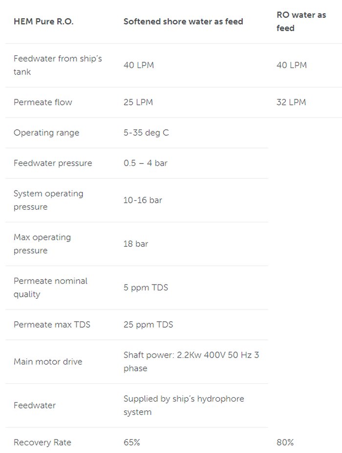 The HEM® Puro RO unit produces up to 1.5m³/hr (32 ltr/min) at a maximum salinity of 25 ppm TDS. These units are specially designed to produce demineralised water which can be used as technical water, most frequently for washing down the hulls of yachts, especially if they are of a dark colour. This saves a lot of manpower and time when it comes to the hull washdown, since the demineralised water leaves no streaks or traces.