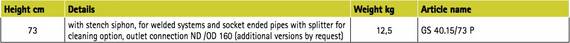 ROMOLD PE-road gully ND 400, with outlet ND 150 for grating 500 x 500, outlet connection ND /OD 160, for connection of PVC pipe in accordance with DIN EN 1401, for PP pipe in accordance with DIN EN 1852 or for PE pipe in accordance with DIN 8074/75 or DIN EN 12666. Road gully with stench trap/siphon incl. connection for camera inspection or cleaning device. Connection with plug made of NBR for sealing in operating state and for extraction during cleaning and inspection procedures. Height: 73 cm.