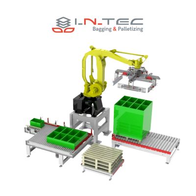 Full layer box palletizer, we adapt the type of mosaic and number of boxes per pallet and their dimensions. Boxes: 40x30 / 50x30 / 60x40 - Production: 10 -15 boxes/min - Max height: 2650 mm.