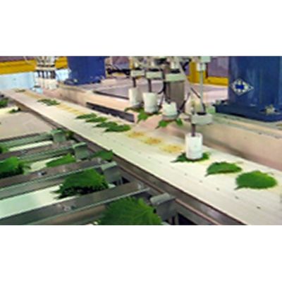 The shape and size ofJapanese basil leaves called “ooba” are graded by a robot equipped with a precision CCD camera. Then the leaves are sorted by arranging them together by their petioles and aligning a batch of leaves at a preset pitch. Operating efficiency can be improved by installing an automatic supply unit (option) to the sorter.