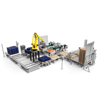 Standard bag palletizing cell using FANUC’s M-410iB/140H robot with automatic pallet handling and other options. Reaches speeds of up to 24 BPM.