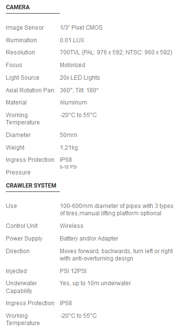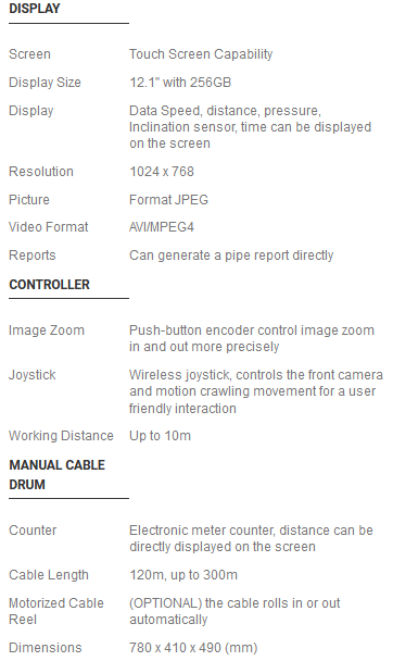 50 mm/1.96" in camera head, 700TVL resolution. Pan and tilt view head. 6-wheel crawler body for 100mm to 600mm. Crawler body for 100mm to 600mm pipes. 12.1" inch display controller (256GB hard disk). Remote control box. l20m/4.72" in cable reel with counter. Includes keyboard and mouse. 110/220V power supply. 48V battery optional. Cable guide appropriate for manhole and underground control. Hook to lower down the crawler. Tools and screws. Can generate reports.