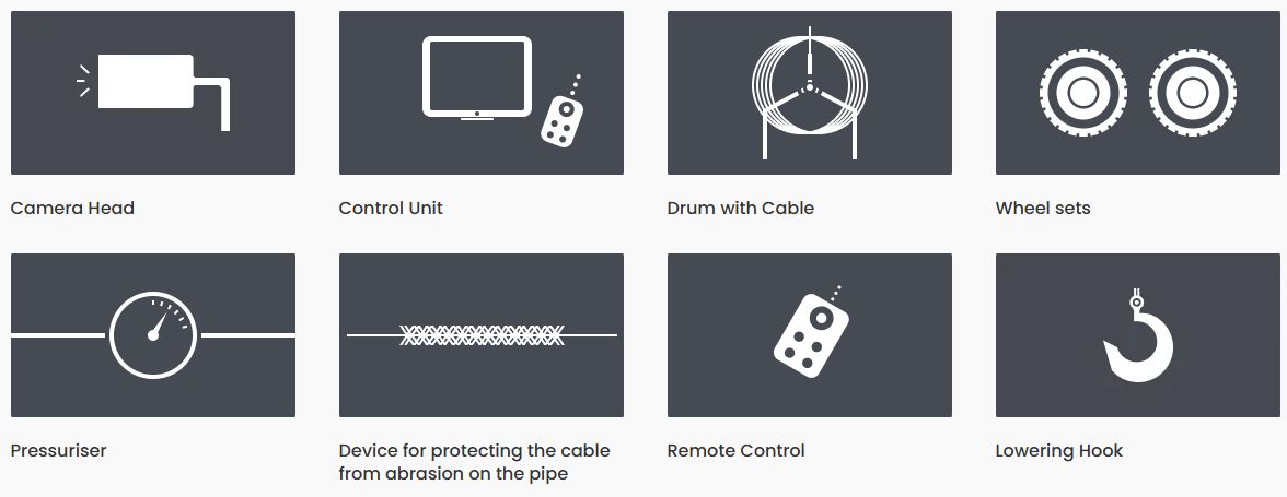 Pipeline Inspection Robot SIGMA 100 HD offers a tractor that can be used with multiple wheel sets and a mounted mechanical camera elevator. If required, the tractor can be equipped with a high-definition rear backup camera to aid in backing up. The pipeline tractor is equipped with a two-axis hinged connector that aids in pipeline entry as well as the ability to be pressurized for water resistance. The SIGMA 100 HD tractor has a 6x6 drive that is powered by two electric motors. Integrated into the tractor are several sensors that measure the internal pressure, incline of the pipeline, turn of the pipeline, and the roll of the tractor. These signals are reported to the contorl post of the inspection unit and offer valuable information for the inspection.