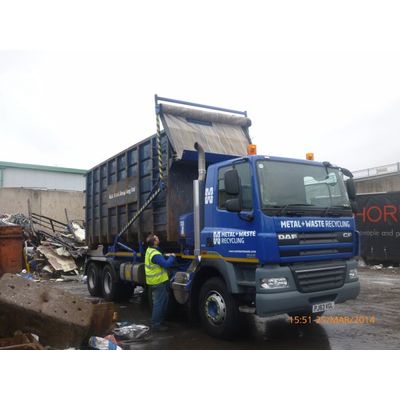 The Shur-Co Gladiator is a robust hydraulic sheeting system for hookloaders and drawbar trailers. The driver adjusts the tarp mechanism safely from ground level to sit a spring roller neatly on the rear of the container; side flaps on the tarpaulin cover can then be pulled down with an extending hook to secure the load.