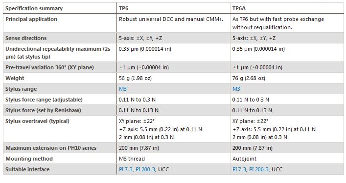 The TP6 and TP6A probes have different probe mount options (M8 thread and autojoint respectively). Both probes are kinematic touch-trigger probes and have manually adjustable trigger force for optimum probe performance with different stylus configurations. They can carry long styli (M3 range), are 25 mm (1 in) in diameter, providing substantial overtravel for excellent robustness.