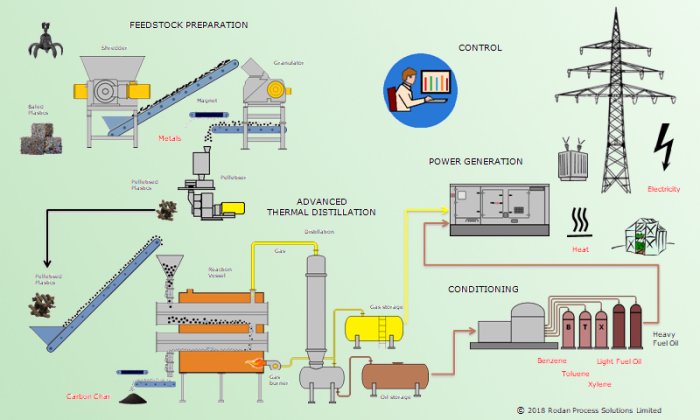 The syn-gas and syn-oil can then be sent through dual-fuel generators to produce electricity, some of which can be used to run the plant and the majority exported to the national grid.