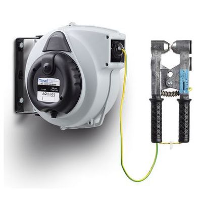 Automatic cable reel equipped with 15 m x 6 mm2 yellow/green cable and by request supplied with earth clamp certified in accordance to the regulations laid down in the standard directive 94/9/CE ATEX. This clamp allows the connection with the earthing system to create an equalization of potential between containers of inflammable products (liquids gas or powder) or those in areas of danger from explosion; this connection must be carried out respecting the appropriate regulations with the correct appliances such as the earth clamp that firmly connect to any hold (from 3 to 20 mm) even on rusty surfaces, assuring the continuity of current.