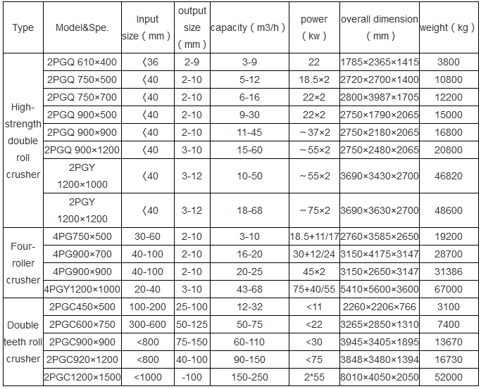 Rroller crusher is mainly of Fixed Roller, Fixed roller bearing seat, Scraper device, Active Roller, Active roller bearing seat, Protection spring and hydraulic system, Bolts to fix spring, Top cover dismantling bolt, Roller observation window, Grease nipple, Machine lifting hole, Feeding inlet, Host pulley, Adjusting bolt of fixed roller, Foundation bolt hole,Bearing temperature sensor (users select the device) and so on.