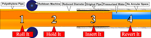 The patented Rolldown process can reduce the outside diameter of polyethylene pipe significantly without affecting the long-term characteristics of the pipe in any way. Unlike other diameter-reducing processes, Rolldown does not stretch the polyethylene or weaken the pipeline material.