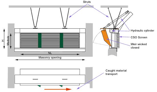 The design of the RSW-K is identical to that of the RSW in the screen area. The same components are used. A rugged, moving weir wicket is attached by means of hinges and tight metal side panels in place of the static retaining panel. An all-round seal on the carrier frame of the CSO screen ensures tightness at three sides when the weir wicket is closed. When open, the weir wicket seals against the lateral guides. The weir wicket is driven by two control cylinders which move synchronously owing to the incorporated displacement measuring systems. The anchoring system of the control cylinders is integrated in the frame structure. The structure itself is thus not loaded additionally.