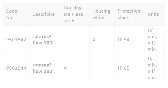 Peristaltic pump for continuous delivery in speed ranges from 5 to 500 revolutions per minuter rotarus flow 100 is a comfortable, rapid delivery pump for high flow rates with control options for velocity and flow speed. Performance class with 100 Watt ensures rapid delivery in speed ranges from 5 to 500 revolutions per minute. Housings are available with a white powder coating (protection class IP54) and inox stainless steel design (rotarus flow 100i, protection class IP65). RFID technology is used in the rotarus flow to detect the pump head. The model also has automatic blockage detection and hose rupture monitoring. A control panel for the most important functions is integrated directly into the housing. In addition, rotarus flow is equipped with an external control unit with touchscreen. The pump head connection technology ensures rapid handling.
