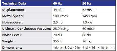 The Republic RCV-60 dry-running 2.0 hp rotary claw vacuum pump has capacities of 62 m3/hr for 50 Hz and 44 cfm for 60 Hz. Republic Rotary Claw Pumps are dry-running positive displacement claw vacuum pumps ideally suited for oil-free applications. They are single stage, air-cooled, and direct driven for continuous operation. The design is one of the most reliable and efficient vacuum pumps available. The pumps utilize high-precision machined claws that rotate in synchronization without contact to generate vacuum without wear. These rugged pumps are simple to install and require minimal service and maintenance.