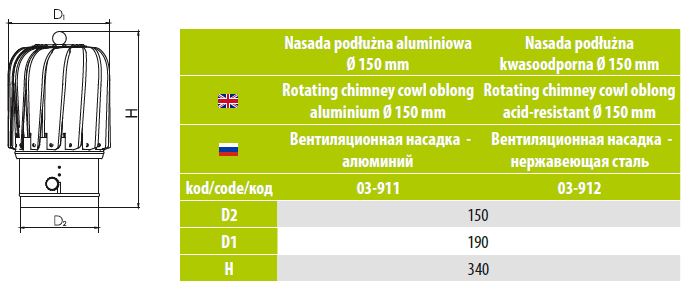 Oblong rotating cowl is used in chimney ventilations ducts. Oblong cowl is made in diameter 150. Cowl can be made from aluminum material or acid-resistance material.
