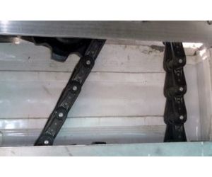 The helical skimmer assembly is driven by a gear motor with a cast nylon drive sprocket mounted to a steel output shaft. A steel drive shaft is flange-mounted to the reel assembly and keyed to a cast nylon driven sprocket. Non-metallic drive chain engages the sprockets, which rotate the reel assembly in two self-aligning cast iron bearings with UHMW-PE linings. Multiple tanks can be driven by a single gear motor equipped with over-torque protection, which is also used to disengage a mechanism.