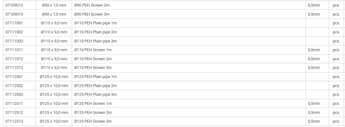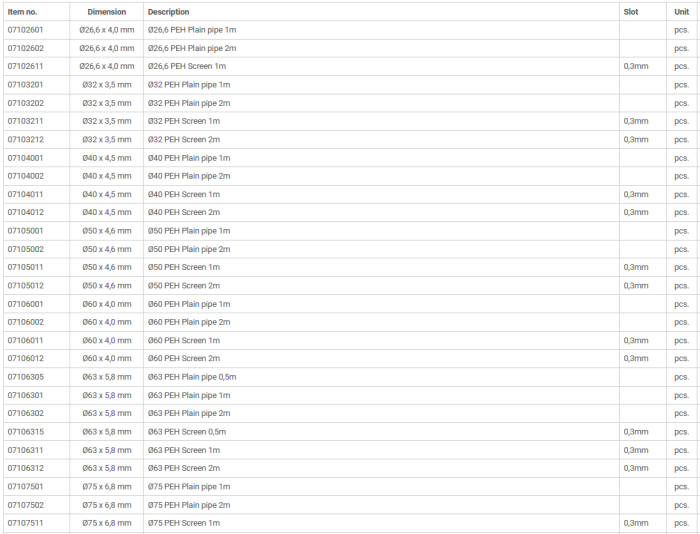 Uncoloured HDPE pipes and screens according EN12201 and KIWA certified according to KQ-56, which describes the demands for pipes and screens used for environmental wells. The pipes are supplied with flush joint threads. More dimensions, lengths and slot sizes available upon request.