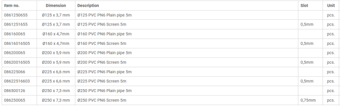 PVC socket pipe PN6 for glue joining. More dimensions, lengths and slot sizes on request.