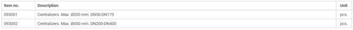 Centralizers in uncoloured PP for all type of pipes. Mounting with strips. These centralizers are available in 2 versions; One is used for pipes from Ø 63mm to Ø 225mm and can be individually positioned from 20mm to 70mm height. The other is used for pipes from Ø 225mm to Ø 450mm and can be individually positioned from 20mm to 140mm. 1 set consists of 3 centralizer blocks and 2 strips.