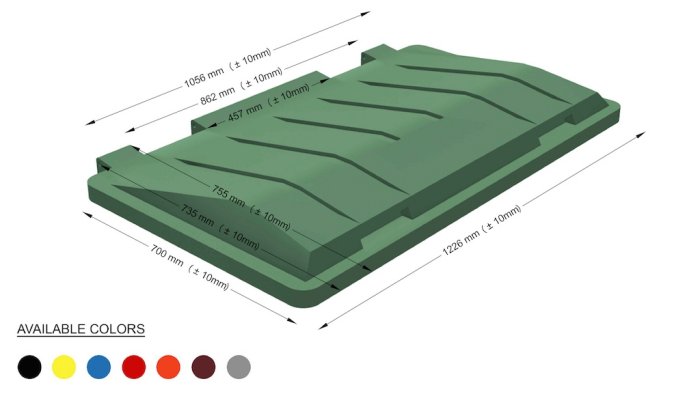 Double walled plastic lid 660 & 770 litres for waste bins and containers, produced with the method of rotation molding, are made of linear medium density polyethylene resin (LMDPE), with antioxidants and are not affected by solar radiation thanks to ultraviolet stabilizers (UV protection). The polyethylene used is 100% recyclable for molding.