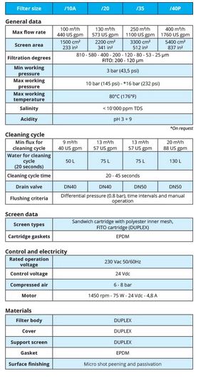 ROTOR HP DUPLEX self cleaning screen filters are designed for filtration of sea water or brackish water. Housing, covers and the most important components are made of DUPLEX steel to gives them exceptional resistance to wear and corrosion also in harsh environments. They can be supplied in two different configurations (L and O) depending on the position of In/Out connections. Special suction pads ensure the complete cleaning of the screen with minimum water consumption and without stopping the filtration process. The filtering cartridge can be supplied either as a polyester mesh inserted between two DUPLEX steel net tubes or as a DUPLEX steel cartridge (fito); with this solution the filtration degree ranges from 25 µm to 810 µm.