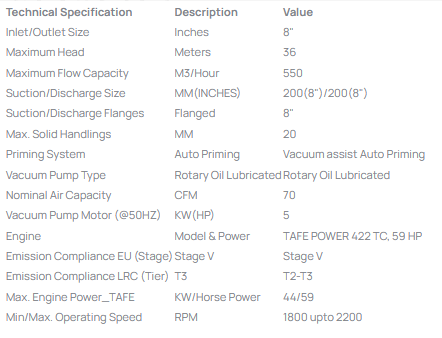 The ROVER 8-inch diesel-driven dewatering pump is a powerful and reliable solution for handling wastewater, dirty water, and solids-laden fluids. Powered by a robust TAFE Power diesel engine, this centrifugal pump is engineered for demanding environments where electric power may not be available or practical. Ideal for use in construction dewatering, mining operations, sewage bypass, and flood control, this pump is built for high performance, durability, and ease of use.