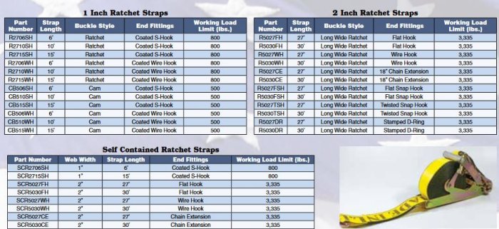 Ratchet Straps are easy to use and quickly tighten to the contour of the load. Our ratchet straps are fabricated with high strength polyester webbing that has been treated for abrasion resistance. All ratchet straps are labeled to meet CVSA guidelines, CHP standards, DOT regulations and WSTDA recommended standards.