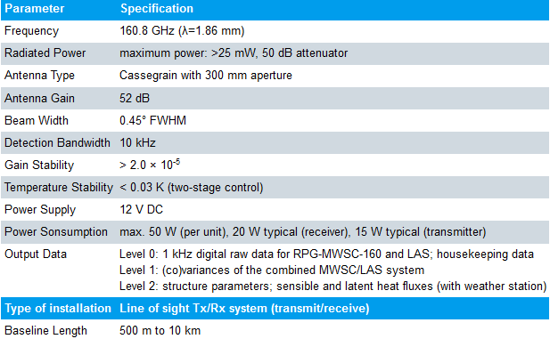 The microwave scintillometer RPG-MWSC-160 provides latent and sensible heat flux observations within the atmospheric surface layer, when it is conbined with an optical Large Aperture Scintillometer (LAS). In 2014 Radiometer Physics GmbH (RPG) released the first commercially available microwave scintillometer RPG-MWSC-160. It was designed for combined operation with an optical Large Aperture Scintillometer (LAS) to observe sensible and latent heat fluxes at the same time.