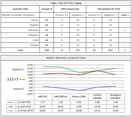 - Highly specific in differentiate B*5701 from B*5702, B*5703, B*5704.