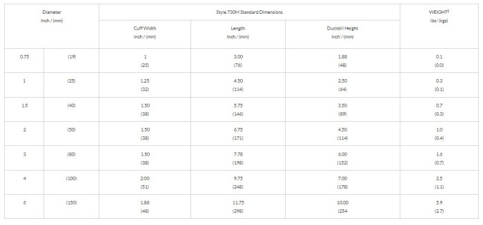 The ProFlex™ Style 730M is the most recent addition to the ProFlex™ line of rubber check valves. The Style 730M is a molded rubber light weight check valve. This type of check valve is available ranging in sizes from 3/4” to 6” pipe diameter and can be directly mounted to the OD of schedule 40 pipe. The complete size range is supplied with a ¾” -300 Stainless Steel Worm Gear clamp ready for quick set up and installation. Through its rubber bill, media will pass creating a low head loss valve, complete with a zero back flow feature. Its ability to prevent backflow into the mating pipe system is a quality aspect in “checking” pipes or tanks that often have problems with back flow problems. Best for odor control.