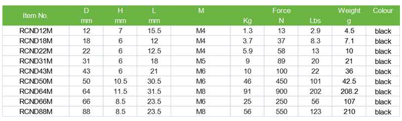 Ranging from D12mm(with M4 male thread),D31mm(with 5 male thread) to as big as D66mm(with M6 male thread) and D88mm(with M8 male thread). With the Min vertical holding force of 13N and the Max vertical holding force of 550N.