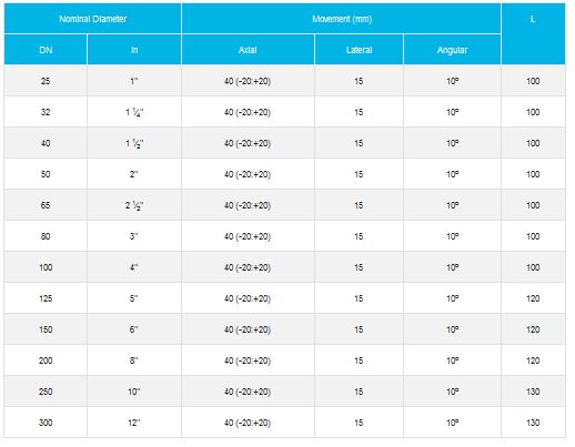 16 bar pressure, 110 °C temperature. Rubber bellows is consisted of special rubber, steel wire and reinforced nylon-cord. Good solution for vibration, noise and dilatation problems. Absorption of axial, lateral, angular and transverse movements. Easily installation with its floating flanged. Joints and seals are not needed.