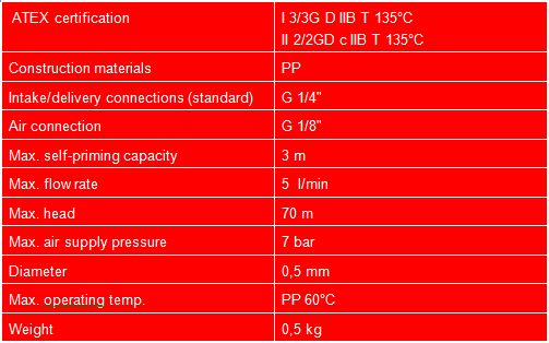 For delivery rates up to 5 l/min. Atex Certification: STANDARD : II 3G Ex h IIB T4 Gc – II 3D Ex h IIIB 135°C Dc. CONDUCT: II 2/2 G/D Ex h IIC T4 Gb/Db – I M2 Ex h Mb. Construction Material: PP , PP+CF. Intake/delivery connections: G 1/4”. Air connection: 1/8”. Max. flow rate: 5 L/min. Max. flow pressure: 7 bar. Operating pressure: Min. 2 bar – Max. 7 bar. Max. suction head: 3 m. Max. size of solids: 0,5 mm. Max. operating Temperature: 60°C. Weight: 0,5 Kg.