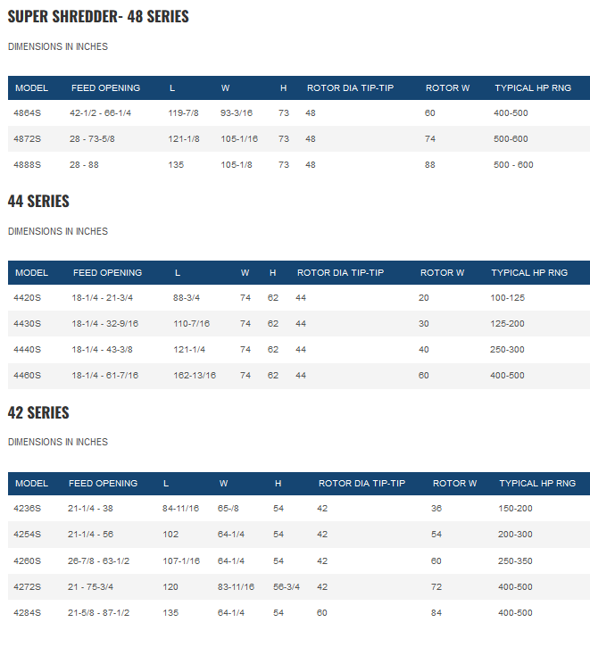 Our rugged Hammermill equipment comes in a range of styles, sizes, and capacities to meet any challenge. Large diameter hammer circle and throat widths range from 20” to 60” enable processing capacities to range from 1 to 100 tons per hour. Custom control features are also available, including motor starters/controls, auto-reversing, and load sensing feed control.