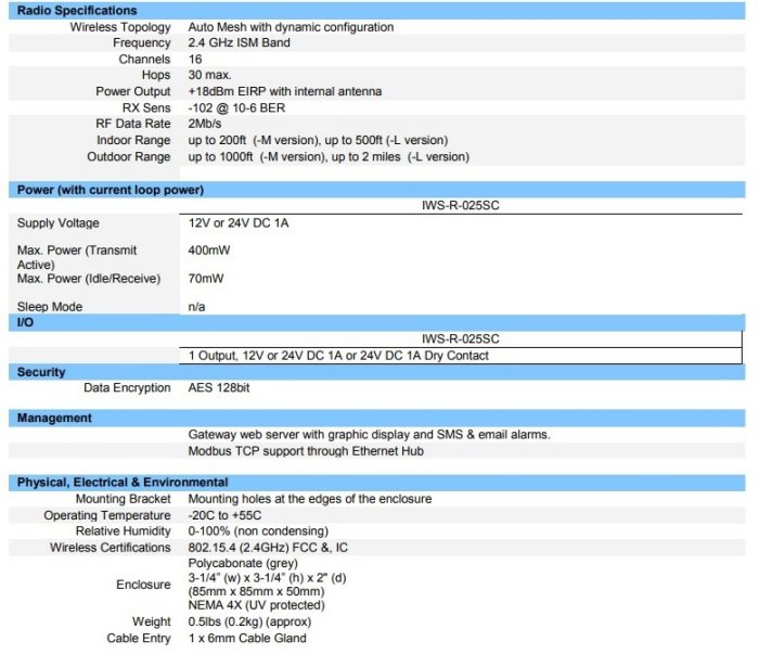 The Intelligent Wireless System (IWS) nodes comprise of a range of distributed wireless products from Plexus Controls providing advanced supervisory, control and data acquisition (SCADA) functionality for commercial and industrial applications. With `out the box` auto mesh wireless functionality, IWS nodes can be easily installed at a remote location and connected to standard sensors, supporting 4-20mA, 0-5V, 0-10V, HART, temperature, pressure and many other interfaces. Either through a direct wireless connection or automatically hopping through a series of repeater IWS nodes, the sensor data is relayed back to the IWS Hub for termination over Ethernet to the IWS Management Server application for display, logging and alarm management.