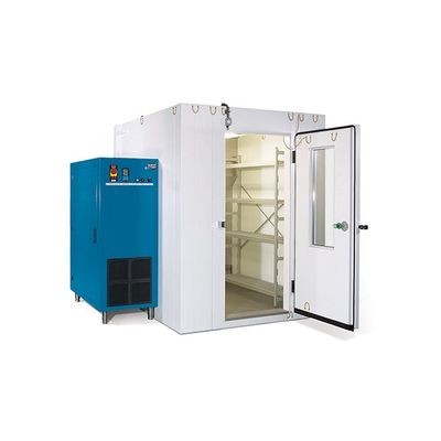 The chamber is equipped with aluminium shelves. Also an execution in stainless steel or a mobile shelving system is available.