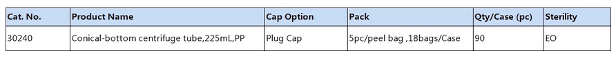 Conical-bottom Centrifuge tube,225mL, transparent, with plug screw cap. Manufactured from virgin ultra clear Polypropylene. Leak-proof at -95kPa (14psi). Maximum accuracy of graduations at±2%. DNase/RNase-free;Non-pyrogenic<0.125EU/mL. Centrifugation (max.RCF): 6,000 x g.