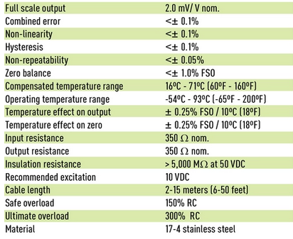 The model HRS hermetically sealed 17-4 stainless steel submersible load cell, it is submersible to 95psi and can be used in both tension and compression. The optional molded mating connector is available with 6`, 12`, 20`, and 50’ cable lengths. Capacities: (lb) 1K, 2K, 3K, 5K, 10K, 20K, 30K, 50K.