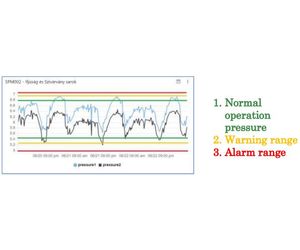 If threshold values, defined jointly with the user, are reached or exceeded, the system sends a warning signal / alarm, as well as advice based on trend analysis; e.g. alarm can already be sent in case of nonproper operation or pressure change, not just when the limit values are reached.