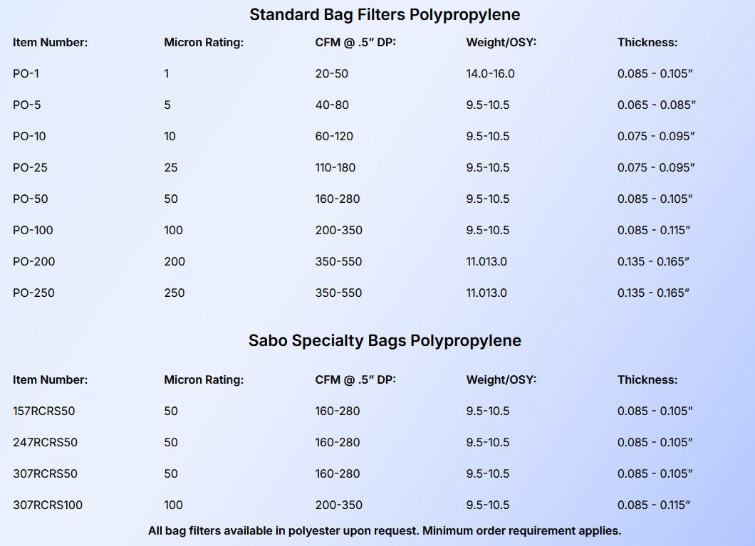 All of our bag filters are glazed to minimize fiber migration and are provided with a galvanized steel snap ring along with handles for ease of replacement. The thread used by Sabo is silicone free.