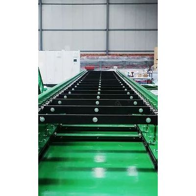 The material is transported by means of moving special poly-amide beams attached on metal slats, which drag it from the floor of the casing towards the discharge of the scrapper.