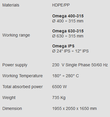 OMEGA 400 – 315 and OMEGA 630 - 315 are a saddle fusion machines for workshop use. Perfect to manufacture special parts, such as reduced tees and crosses for water pipeline used in drainage/sewerage applications.