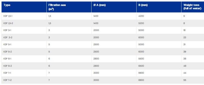 The KS Filter is equipped with a unique Double Sand Backwash device that allows flexibility and reliability in operation.. The backwash of the sand is the most important process parameter for this type of filter. The sand is taken from the bottom and is pumped by an airlift into the washing chamber. From there it falls back on the top of the sand bed. The quality of the filtered water depends on the size of the sand and on the sand backwash rate. Therefore the KS Filterâ„¢ is equipped with a sophisticated and carefully sized double backwash facility. This design allows a wide variation and fine setting of the backwash parameters. Eight sizes available : 1,5 to 7 m2 filtration area with 1 or 2 m deep sand filter.