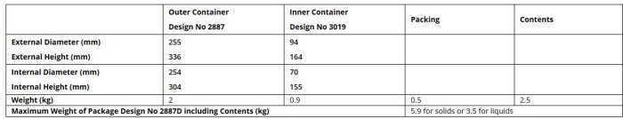 The SAFDRUM consists of an Outer Container Drum (Design No 2887) which carries a resealable leak-tight Inner Container (Design No 3019) within an expanded polystyrene. Cavity: 70mm x 155mm (inner).