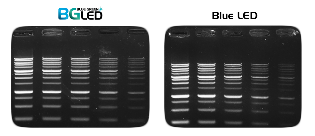Ultra-high sensitivity of DNA bands detected with MIDORI Green Xtra. Left: Detection with a Blue/Green LED transilluminator. Right: Detection with a Blue LED transilluminator.