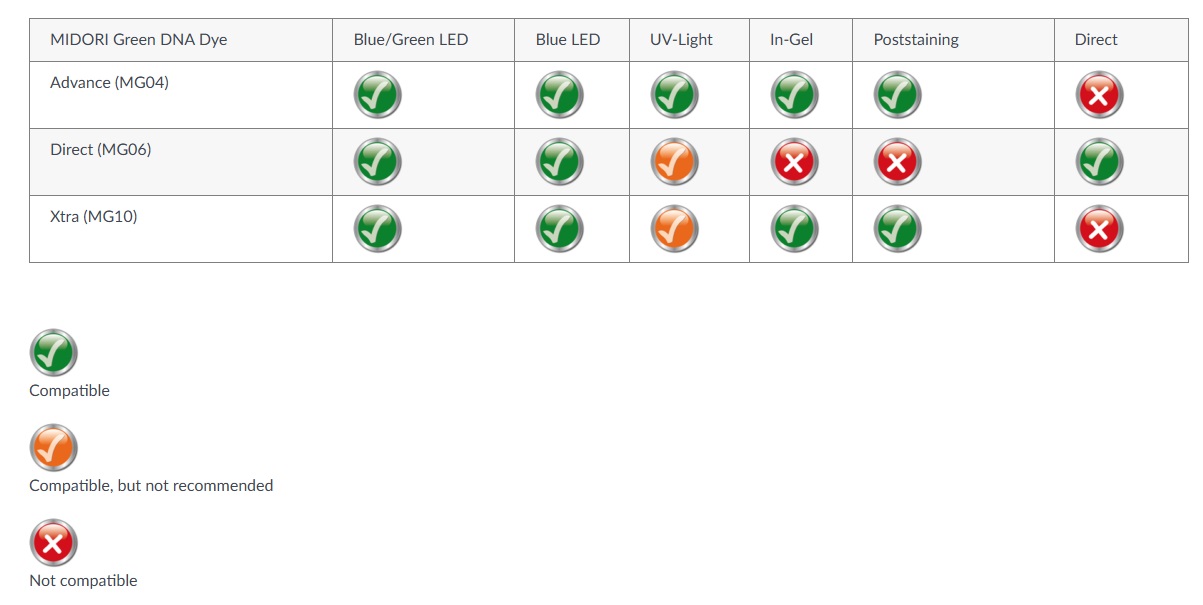 - MIDORI Green Advance (for UV-light or Blue/Green LEDs, in-gel or post staining)