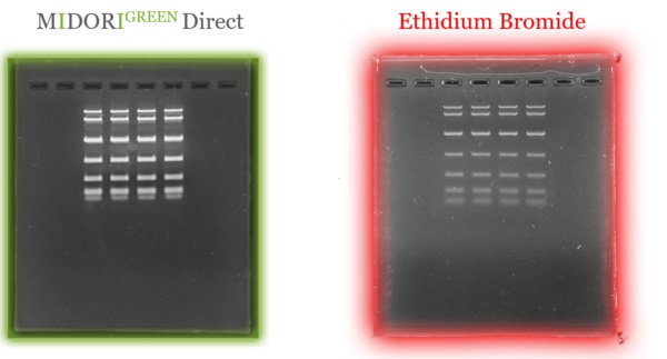 Safe DNA/RNA stain added directly to the samples with loading dye included. MIDORI Green Direct is a safe alternative to ethidium bromide for visualization of double-stranded DNA, single-stranded DNA, and RNA in agarose gels. In contrast to most other non-ethidium bromide based dyes, MIDORIGreen Direct is just added to your samples. The loading dye is already included. You do not need to add any other loading dye to both gel matrix and running buffers